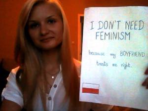 Now, almost anyone I know who calls themselves a feminist, know full well that a woman is not defined by her oppression, nor is a man’s natural state that of a rapist. In fact you could take a lot of these ‘messages’ change ‘I don’t need feminism because…’ to ‘I do support feminism because…’ and the message would still make sense. It all seems like a vast case of ignorance and misunderstanding of the differences between feminism and misandry.